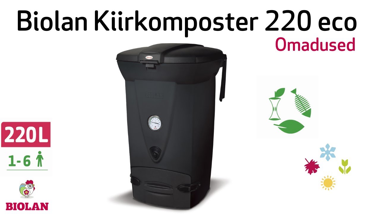 Biolani Kiirkomposter 220 eco on ette nähtud köögijäätmete aastaringseks kompostimiseks. Tänu soojustatud konstruktsioonile ja tõhusale ventilatsioonisüsteemile valmib kompost kiiresti. Kompostimise imet saab jälgida termomeetri ja tühjendusluugi kaudu. Kiirkomposter 220eco on arvestatud ühe perekonna (1–6 inimest) biojäätmete jaoks.